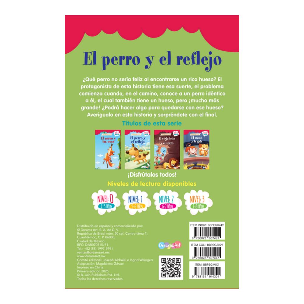 ¿Qué perro no sería feliz al encontrarse un rico hueso? El protagonista de esta historia tiene esa suerte, el problema comienza cuando, en el camino, conoce a un perro idénticoa él, el cual también tiene un hueso, pero ¡mucho más grande! ¿Podrá hacer algo para quedarse con ese hueso? Averígualo en esta historia y sorpréndete con el final. Este título forma parte del Plan lector Aprendiendo a Leer con Dreams art de 4 niveles a partir de la graduación de los textos por su complejidad, tamaño de letra y número de palabras. Además cuenta con un glosario para enriquecer el vocabulario del lector.